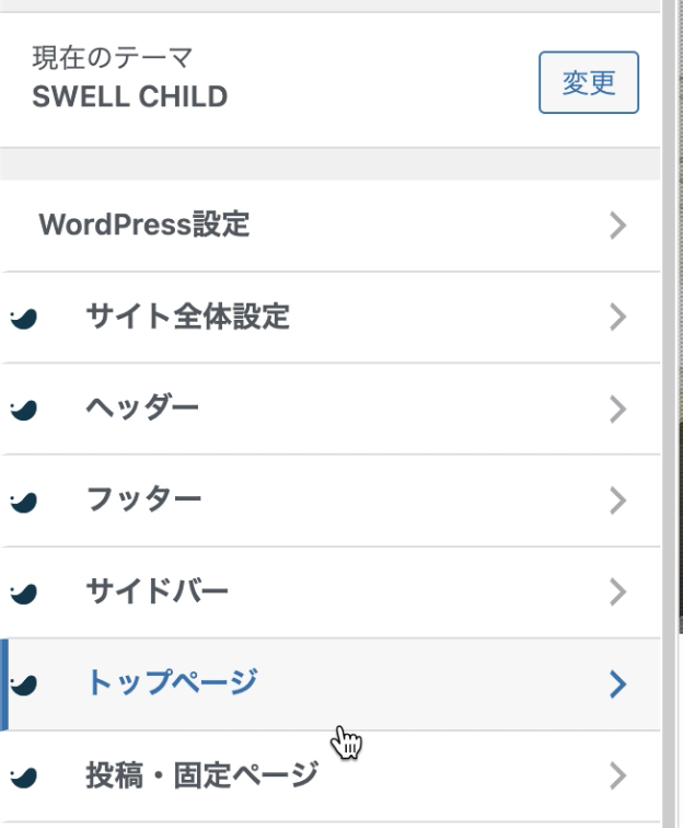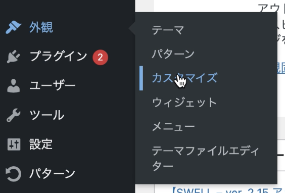 swellでのトップページを編集できる場所は、「外観」>「カスタマイズ」から遷移