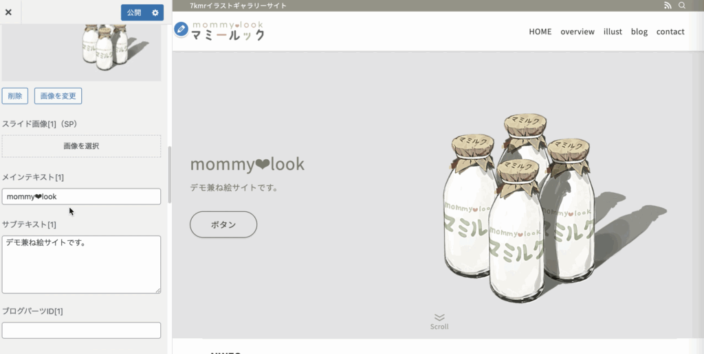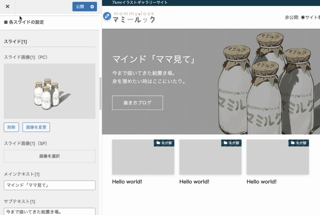 こちらは、冒頭でも紹介していたメインビジュアルとスライドの設定です。
